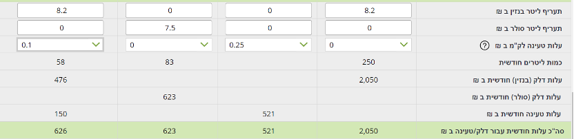 מזינים נתוני תדלוק/טעינה: מזינים תעריפי ליטר בנזין/סולר ועלות טעינה לק”מ בש”ח. בסיום השלב מוצגות עלויות התדלוק/טעינה על פי נתוני הצריכה שהוזנו